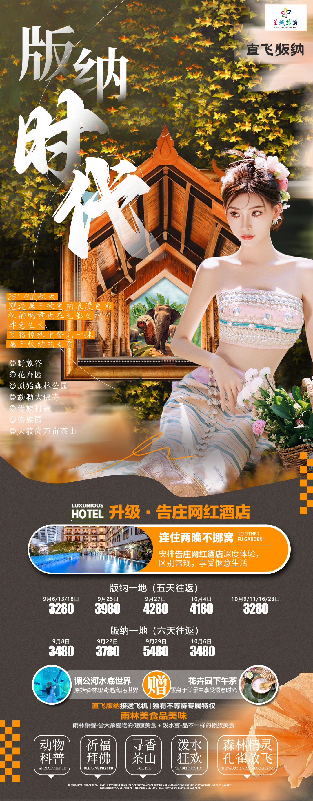 版纳一地 双飞 5日游/6日游 【宁波出发】升级*告庄网红酒店,只要报名,优惠300元/人起️26度的秋天,邂逅属于绿色的浪漫色彩 赠游:湄公河水底世界、花卉园下午茶 美食:安排雨林美食美味,雨林象餐、泼水宴 9月、10月每周三、五、日发团 宁波出港!